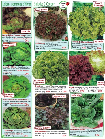 Récolte : mars à mai en pleine terre. à la chaleur. Production rapide de feuilles frisées d’un joli rouge. Réf.3360 - 3 g ............................................... 2,15€ de bonne qualité, excellente saveur.