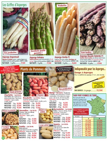 Blanche et hâtive, turion à pointes légèrement Variété précoce, pour forte production. Pas de Blanche. Très gros calibre. Rustique et Turion moyen calibre, pas besoin de buttage.