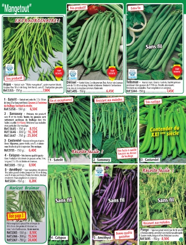 congélation. Résiste bien à la mosaïque. Grain blanc. Réf.5366 - 300 g : 15,50€ 4 - Calypso 5 - Améthyst gustative Gousses rondes, longues et fines. Résistance aux virus.