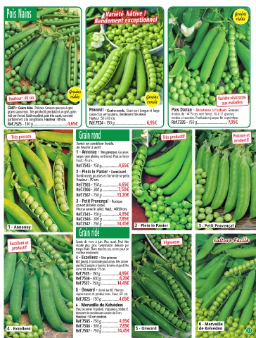 grains savoureux. Très productif, produisant un gros grain Precovil - Grains ronds. Grain vert. Longue et large Pois Dorian - Résistance à l’oïdïum. Gousses