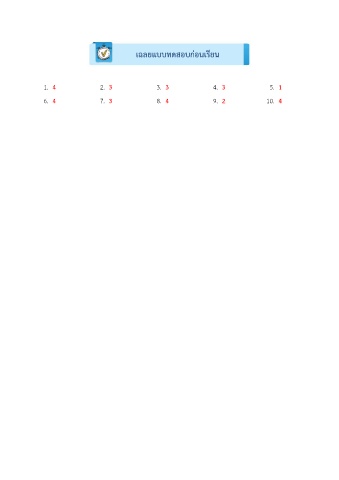 เฉลยแบบทดสอบก่อนเรียน 1. 4 2. 3 3. 3 4. 3 5. 1 6. 4 7. 3 8. 4 9. 2 10. 4