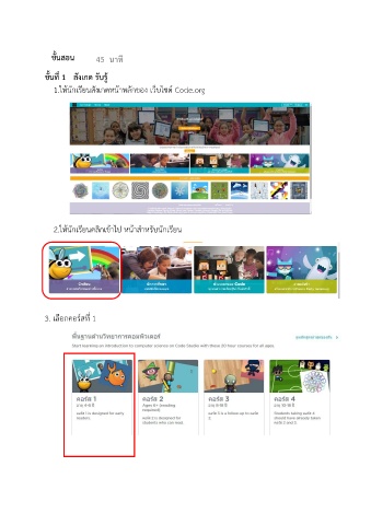 ขั้นสอน 45 นาท ี ขั้นที่ 1 สังเกต รับรู้ 1.ให้นักเรียนสังเกตหน้าหลักของ เว็บไซต์ Code.org 2.ให้นักเรียนคลิกเข้าไป หน้าส าหรับนักเรียน 3. เลือกคอร์สที่ 1