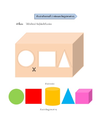 ตัวอย่างกิจกรรมที่ 2 กล่องและวัตถุรูปทรงต่างๆ ค ำชี้แจง ให้นักเรียนน ำวัตถุใส่ลงไปในกล่อง ตัวอย่างกล่อง ตัวอย่างวัตถุรูปทรงต่างๆ