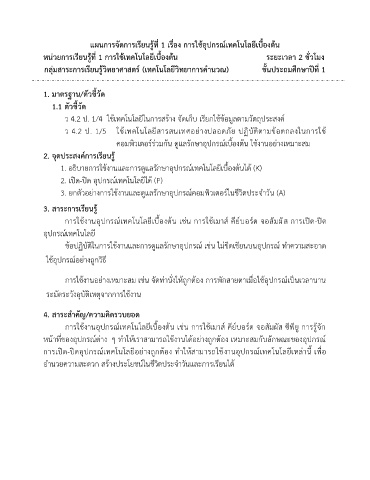 แผนการจัดการเรียนรู้ที่ 1 เรื่อง การใช้อุปกรณ์เทคโนโลยีเบื้องต้น