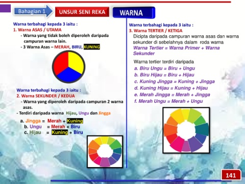 - 3 Warna Asas – MERAH, BIRU, KUNING Warna Tertier = Warna Primer + Warna