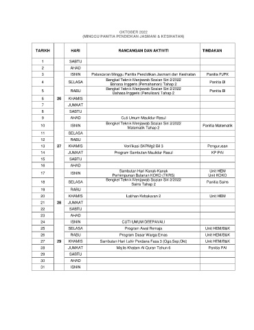 TARIKH HARI RANCANGAN DAN AKTIVITI TINDAKAN