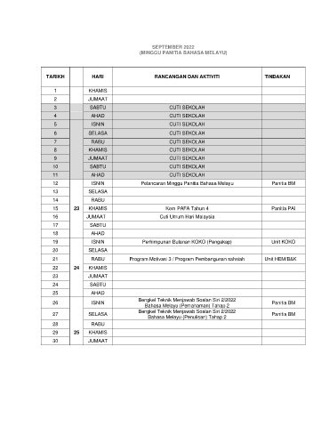 TARIKH HARI RANCANGAN DAN AKTIVITI TINDAKAN