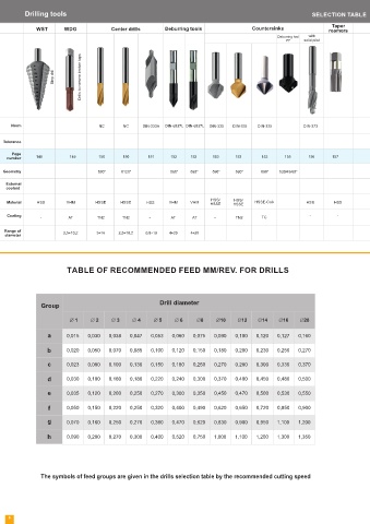 The symbols of feed groups are given in the drills selection table by the recommended cutting speed