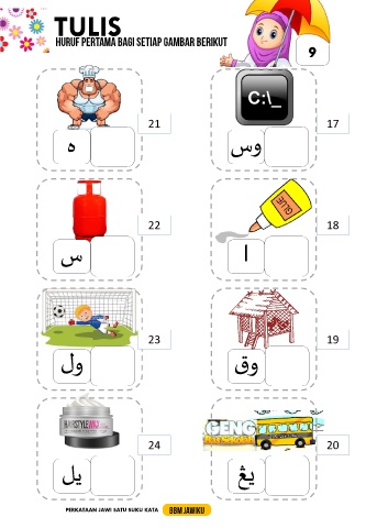TULIS HURUF PERTAMA BAGI SETIAP GAMBAR BERIKUT 9 21 17 ە سو 22 18 س l 23 19 لو قو 24 20 ﻞﻳ PERKATAAN JAWI SATU SUKU KATA BBM Jawiku