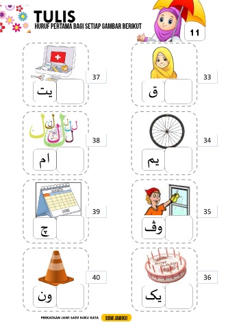 TULIS HURUF PERTAMA BAGI SETIAP GAMBAR BERIKUT 11 37 33 ﺖﻳ ق 38 34 ما ﻢﻳ 39 35 چ و ڤ 40 36 نو ﻳ ﮏ PERKATAAN JAWI SATU SUKU KATA BBM Jawiku