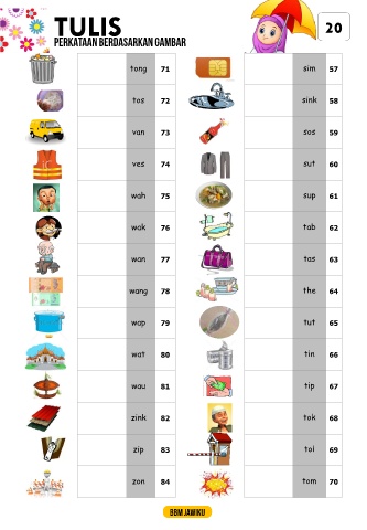 TULIS 20 PERKATAAN BERDASARKAN GAMBAR tong 71 sim 57 tos 72 sink 58 van 73 sos 59 ves 74 sut 60 wah 75 sup 61 wak 76 tab 62 wan 77 tas 63 wang 78 the 64 wap 79 tut 65 wat 80 tin 66 wau 81 tip 67 zink 82 tok 68 zip 83 tol 69 zon 84 tom 70 BBM Jawiku