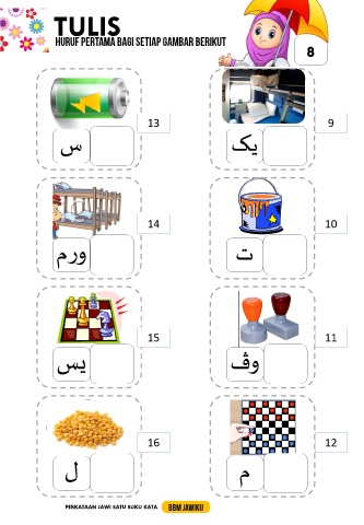 TULIS HURUF PERTAMA BAGI SETIAP GAMBAR BERIKUT 8 13 9 س ﻳ ﮏ 14 10 مرو ت 15 11 ﺲ و ڤ 16 12 ل م PERKATAAN JAWI SATU SUKU KATA BBM Jawiku