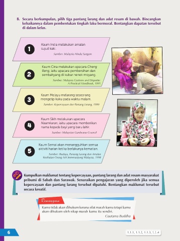 B. Secara berkumpulan, pilih tiga pantang larang dan adat resam di bawah. Bincangkan