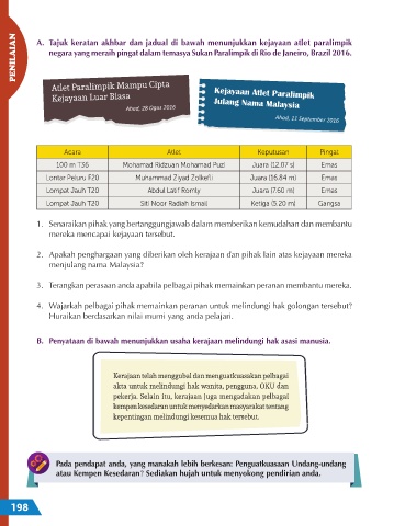 PENILAIAN A. Tajuk keratan akhbar dan jadual di bawah menunjukkan kejayaan atlet paralimpik