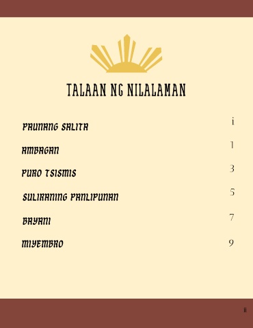 TALAAN NG NILALAMAN i Paunang salita 1 ambagan 3 puro tsismis 5 suliraning panlipunan 7 bayani miyembro 9 ii