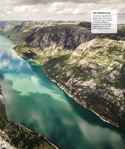 THE POWER OF ICE Carved out of granite by a gigantic glacier more than 12,000 years ago, Lysefjord in southern Norway is overlooked by sheer cliffs towering at least 1,970 ft (600 m) above the water. US_104-105_Fjords.indd 105 01/03/17 1:38 pm