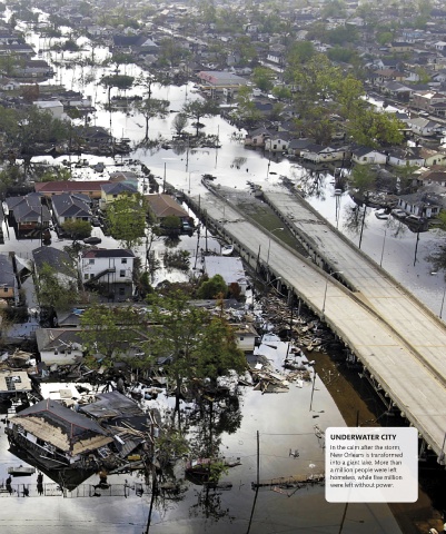UNDERWATER CITY In the calm after the storm, New Orleans is transformed into a giant lake. More than a million people were left homeless, while five million were left without power. US_184-185_Hurricane_Katrina.indd 185 01/03/17 12:26 pm
