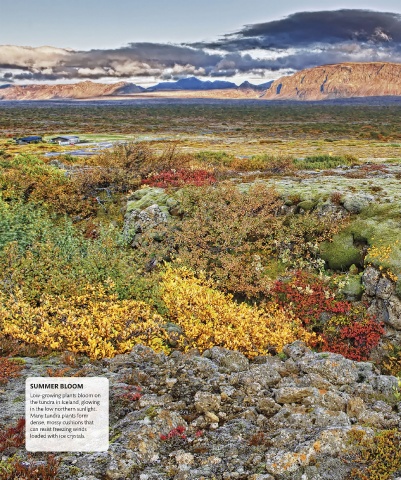 SUMMER BLOOM Low-growing plants bloom on the tundra in Iceland, glowing in the low northern sunlight. Many tundra plants form dense, mossy cushions that can resist freezing winds loaded with ice crystals. US_200-201_Tundra.indd 200 01/03/17 1:39 pm