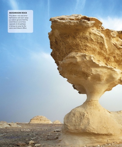 MUSHROOM ROCK This desert rock was once half-buried and worn away just above ground level by wind-blown sand. Now exposed, its broad base is being cut away by the same sand-blaster effect. US_060-061_White_Desert.indd 60 01/03/17 11:21 am