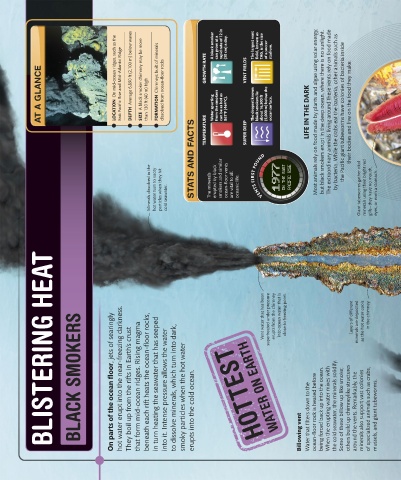 • • • • TEMPERATURE SUPER DEEP LIFE IN THE DARK Most animals rely on food made by plants and algae using solar energy, but black smokers erupt in the deep ocean, where there is no sunlight. The extraordinary animals living around these vents rely on food made by bacteria. While the crabs eat the bacteria, other animals such as the Pacific giant tubeworms have colonies of bacteria inside their bodies and live on the food they make.