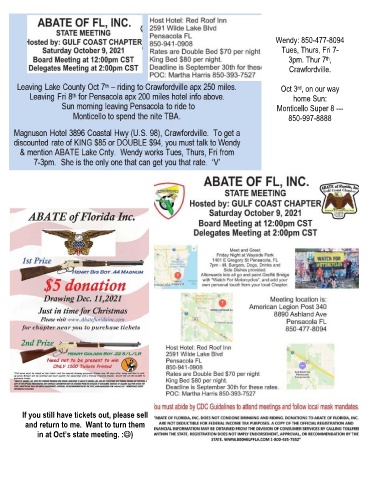 Wendy: 850-477-8094 Tues, Thurs, Fri 7- th 3pm. Thur 7 , Crawfordville. Oct 3 , on our way rd home Sun: Monticello Super 8 --- 850-997-8888 If you still have tickets out, please sell and return to me. Want to turn them in at Oct’s state meeting. :)