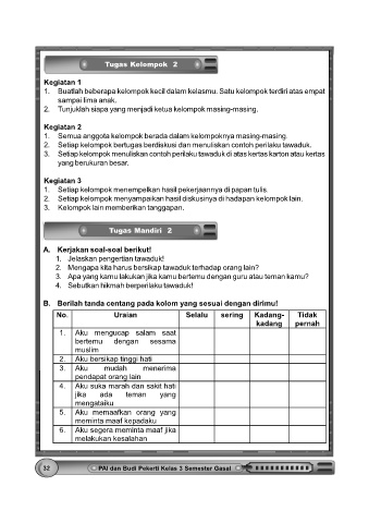 2. Setiap kelompok bertugas berdiskusi dan menuliskan contoh perilaku tawaduk.