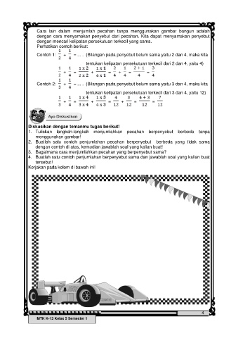 Contoh 1: + = ... . (Bilangan pada penyebut belum sama yaitu 2 dan 4, maka kita