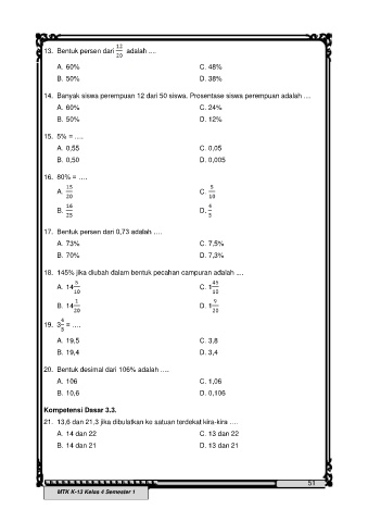 14. Banyak siswa perempuan 12 dari 50 siswa. Prosentase siswa perempuan adalah ....