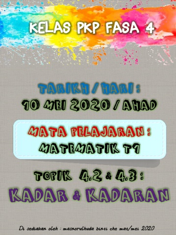 KELAS PKP FASA 4 TARIKH / HARI : 10 MEI 2020 / AHAD MATA PELAJARAN : MATEMATIK T1 TOPIK 4.2 & 4.3 : KADAR & KADARAN Di sediakan oleh : masnorulhuda binti che mat/mei 2020