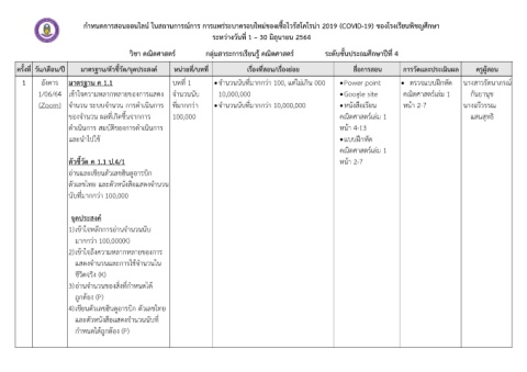 ครั้งที่ วัน/เดอน/ป มาตรฐาน/ตัวชี้วัด/จุดประสงค หนวยที่/บทที่ เรื่องที่สอน/เรื่องยอย สือการสอน การวัดและประเมนผล ครูผูสอน