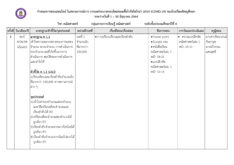 ครั้งที่ วัน/เดอน/ป มาตรฐาน/ตัวชี้วัด/จุดประสงค หนวยที่/บทที่ เรื่องที่สอน/เรื่องยอย สือการสอน การวัดและประเมนผล ครูผูสอน