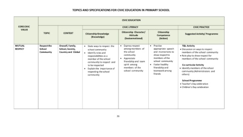 TOPICS AND SPECIFICATIONS FOR CIVIC EDUCATION IN PRIMARY SCHOOL