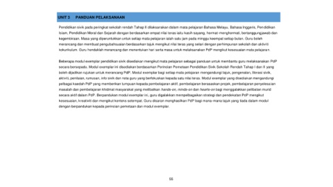 aktiviti, penilaian, rumusan, info sivik dan nota guru yang berfokuskan kepada satu nilai teras. Modul exemplar yang disediakan mengandungi