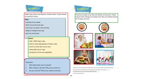 Pupils study Alice’s and Nazira’s routines below. Pupils answer Teacher provides emoji (like and dislike) and pictures. Pupils