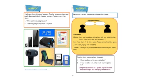 Pupils are given pictures of gadgets. Teacher poses questions and Two pupils role-play the sample dialogue given below.