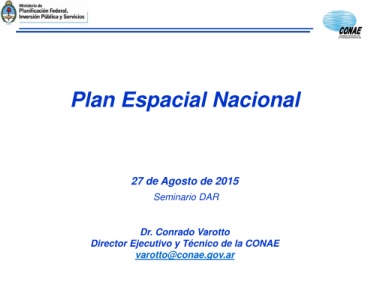 Plan Espacial Nacional 27 de Agosto de 2015 Seminario DAR Dr. Conrado Varotto Director Ejecutivo y Técnico de la CONAE varotto@conae.gov.ar
