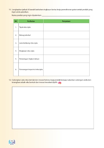 11. Lengkapkan jadual di bawah berkaitan ringkasan kertas kerja permohonan paten untuk produk yang