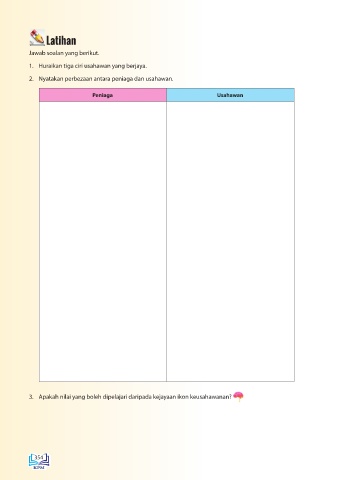 Jawab soalan yang berikut. 1. Huraikan tiga ciri usahawan yang berjaya. 2. Nyatakan perbezaan antara peniaga dan usahawan. Peniaga Usahawan 3. Apakah nilai yang boleh dipelajari daripada kejayaan ikon keusahawanan? KBAT 354