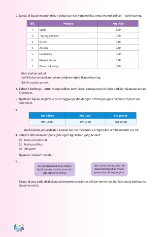 10. Jadual di bawah menunjukkan bahan dan kos yang terlibat untuk menghasilkan 1 kg mi kuning.