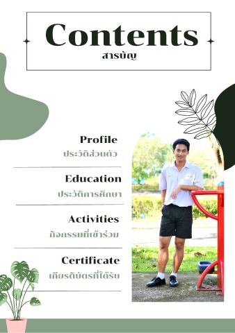 Contents สารบญ ั Profile ประวตสวนตว ั ั ิ ่ Education ึ ิ ประวตการศกษา ั Activities ้ ่ กจกรรมทเขารวม ิ ี Certificate ้ ั ี เกยรตบตรทไดรบ ิ ี ั