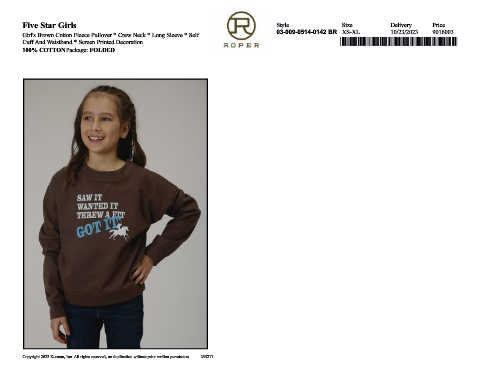 Girl's Brown Cotton Fleece Pullover * Crew Neck * Long Sleeve * Self