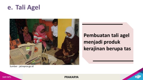 e. Tali Agel Pembuatan tali agel menjadi produk kerajinan berupa tas Sumber : jatimprov.go.id PRAKARYA