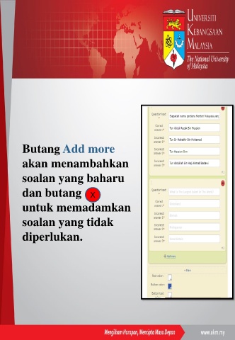 Butang Add more akan menambahkan soalan yang baharu dan butang X untuk memadamkan soalan yang tidak diperlukan.