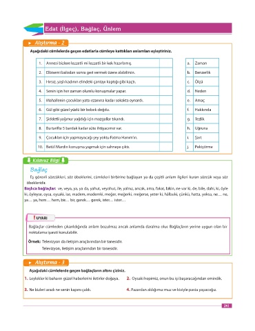 Aşağıdaki cümlelerde geçen edatlarla cümleye kattıkları anlamları eşleştiriniz.