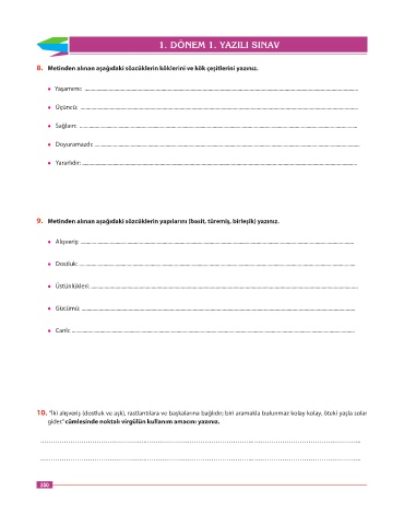 9. Metinden alınan aşağıdaki sözcüklerin yapılarını (basit, türemiş, birleşik) yazınız.