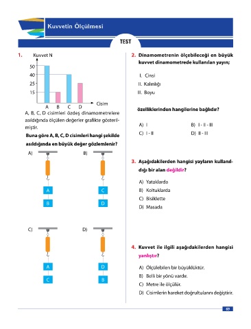 A, B, C, D cisimleri özdeş dinamometrelere