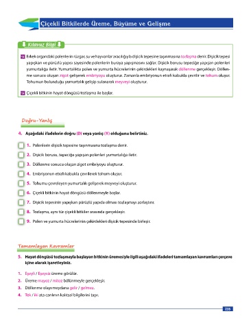 5. Hayat döngüsü tozlaşmayla başlayan bitkinin üremesiyle ilgili aşağıdaki ifadeleri tamamlayan kavramları çerçeve