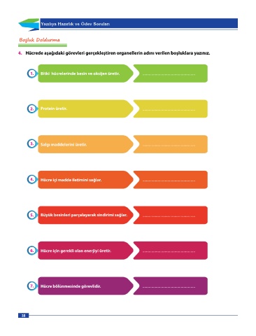 4. Hücrede aşağıdaki görevleri gerçekleştiren organellerin adını verilen boşluklara yazınız.