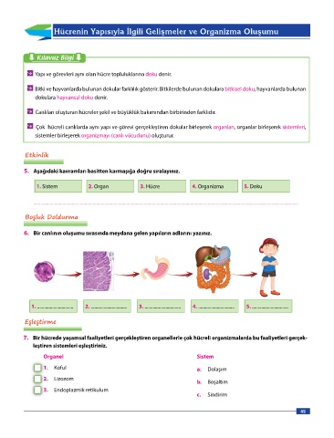 Çok hücreli canlılarda aynı yapı ve görevi gerçekleştiren dokular birleşerek organları, organlar birleşerek sistemleri,
