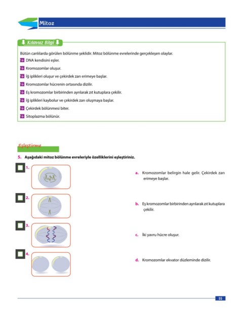 5. Aşağıdaki mitoz bölünme evreleriyle özelliklerini eşleştiriniz.